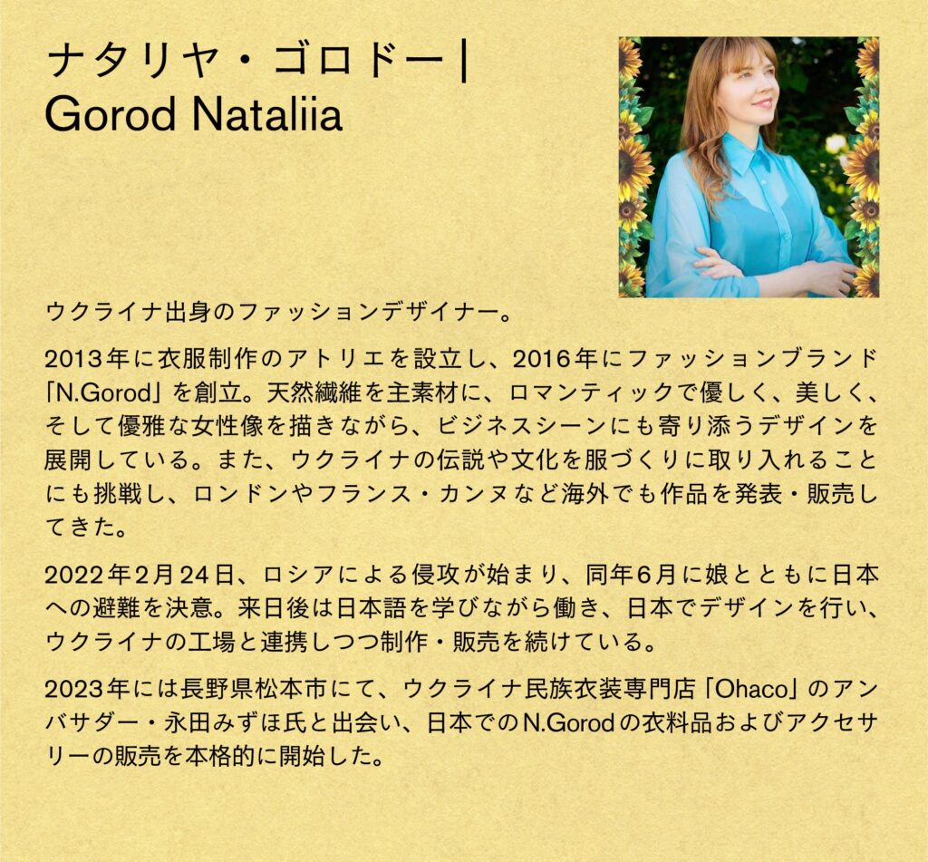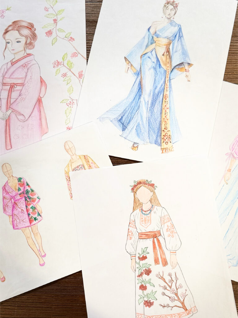 日本とウクライナ、それぞれの国の民族の象徴である植物を服のデザインに取り入れ、個性豊かに表現しました。