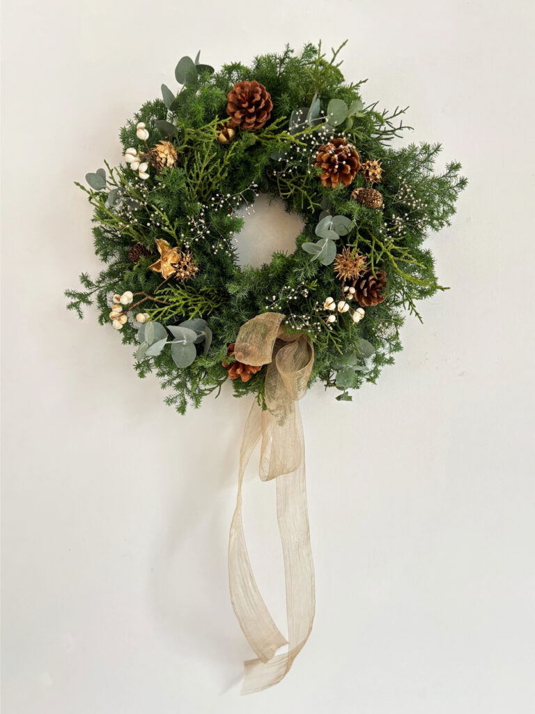 abouther.cafeでのランチ休憩をはさみ、午後はフレッシュグリーンのクリスマスリースづくり。