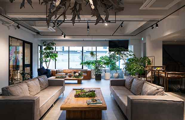 緑に囲まれた広々としたソファー、天井には木の根をモチーフにしたオブジェなど、